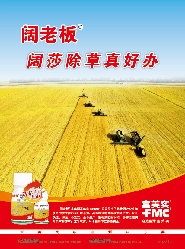 阔老板®是美国富美实(FMC)公司推出的防除阔叶杂草和莎草的优秀苗后茎叶除草剂。具有极强的内吸和触杀活性,除草快速、彻底、不复发;杀草谱广,能有效防除水稻田多种恶性阔叶杂草和莎草;茎叶喷雾,对水稻和下茬作物安全。