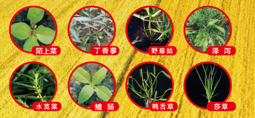 杀草谱广:可以有效防除水稻田多种恶性阔叶草和莎草科杂草,如:丁香蓼、鸭舌草、节节菜、陌上菜、醴肠、水苋菜、水花生、野慈姑、矮慈姑、泽泻、雨久花、野荸荠、碎米莎草、异型莎草、萤蔺、扁秆藨草等。