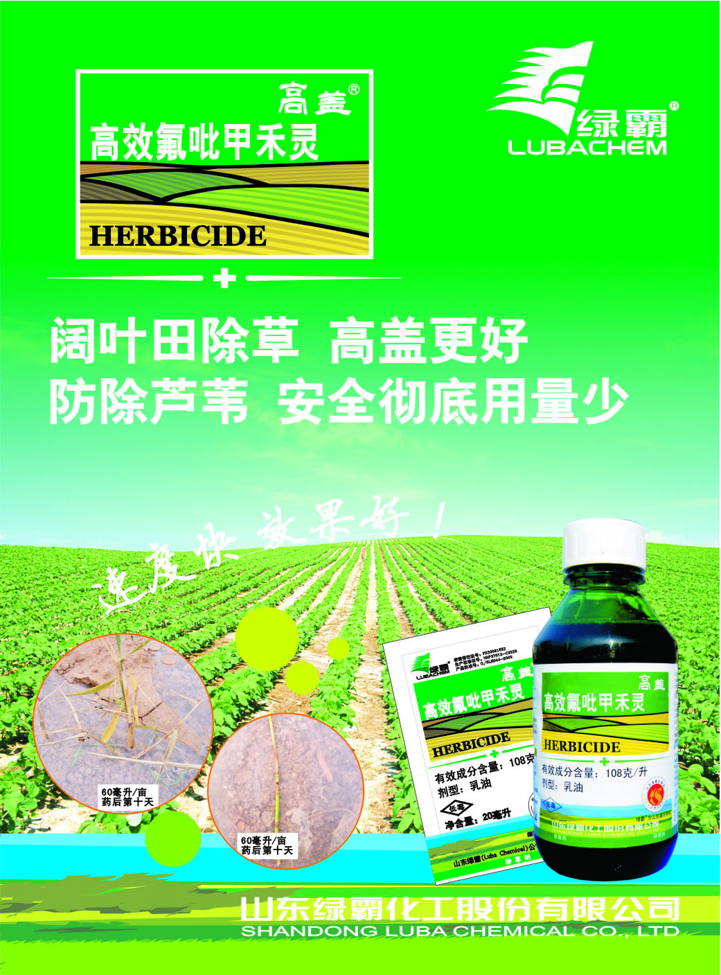 高盖是山东绿霸化工股份有限公司研制开发的超高活性除草剂,它是目前此类除草剂活性较高亩用量较少的一个品种,在众多防治禾本科杂草的除草剂当中高盖108克/升乳油以防治效果好、杀草谱广、传导性号、除草彻底、使用方便等突出特点备受广大农民的喜爱。