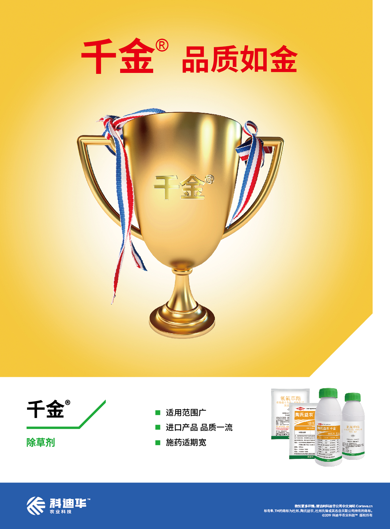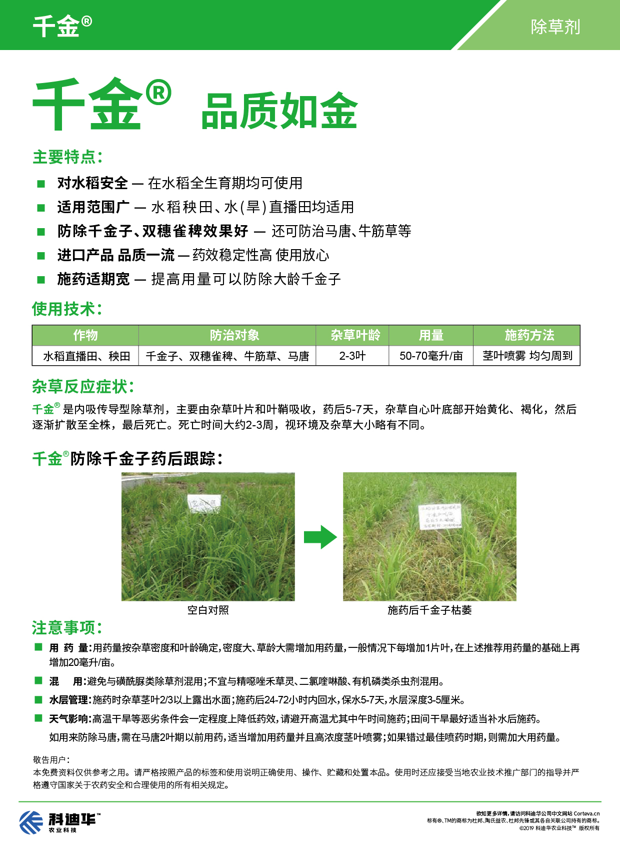 千金®是芳氧苯氧丙酸类传导型禾本科杂草除草剂,用于水稻田茎叶处理防除千金子、稗草(东北秧田)、双穗雀稗等杂草。